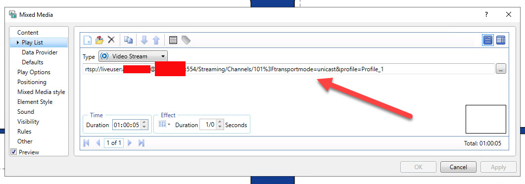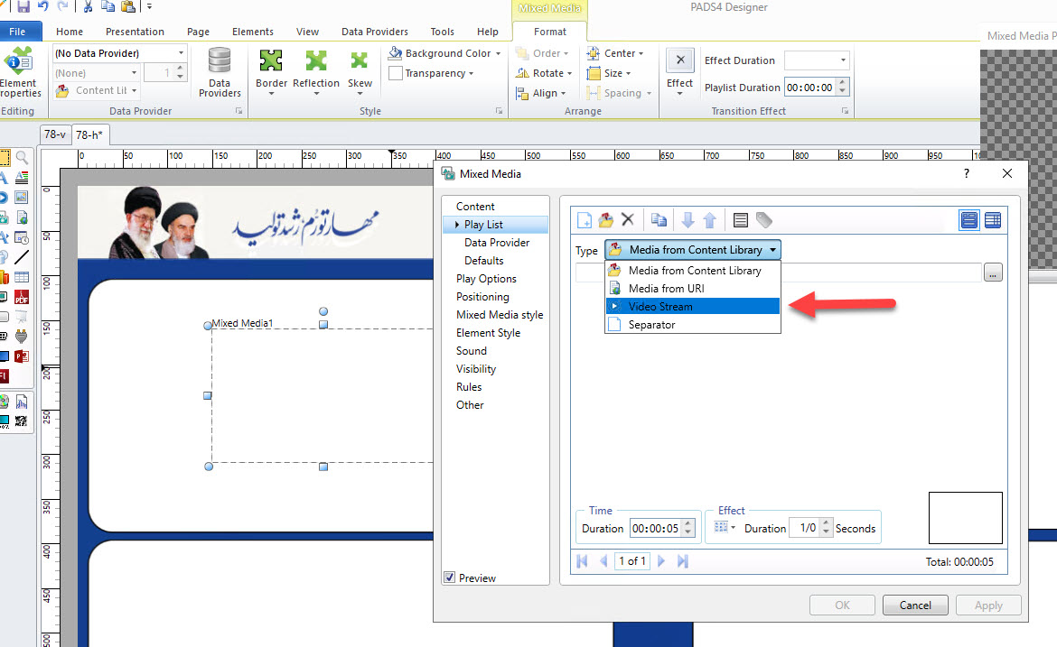در قسمت Mixed media properties منبع این کامپوننت را روی Video Stream قرار دهید: