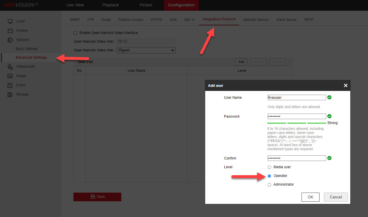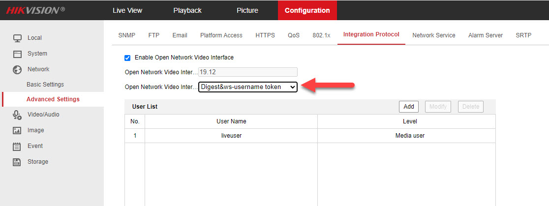 نکته2: در منوی Configuration/Network/Advanced Settings در تب Integration protocol گزینه open network video می بایست روی گزینه ذیل باشد :