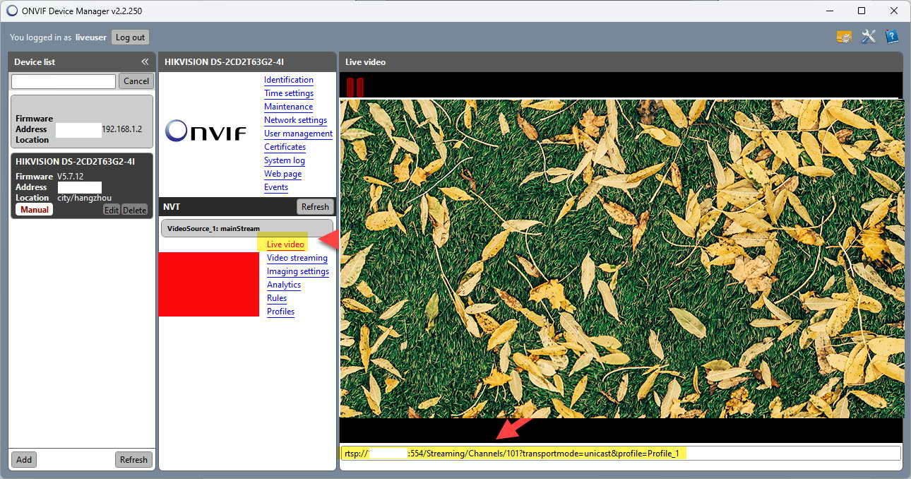4- در این مرحله روی گزینه Live Video کلیک کنید تا لینک دسترسی به دوربین از طریق پروتکل RTSPدر دسترس قرار گیرد: