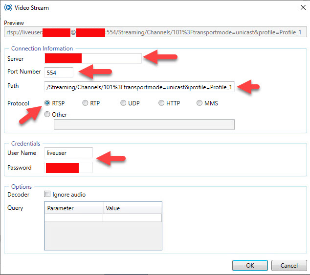 تذکر : در عکس قبل دقت شود ،URL مربوط به پروتکل RTSP از قسمت بعد از عبارت /Streaming در فیلد Path وارد شده است.