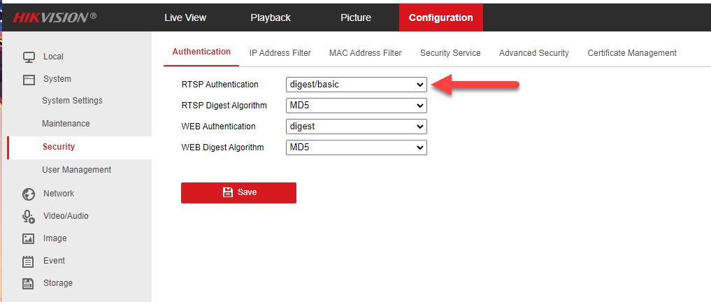 نکته1: در منوی System/Security/Authentication می بایست RTSP Auth. روی گزینه digest/basic تنظیم شود.